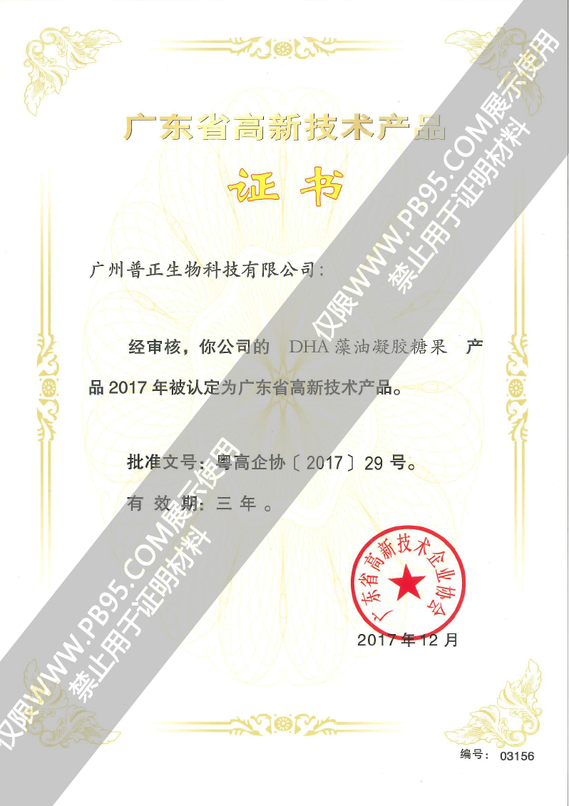 DHA藻油凝膠糖果——17年高新技術(shù)產(chǎn)品證書(shū)