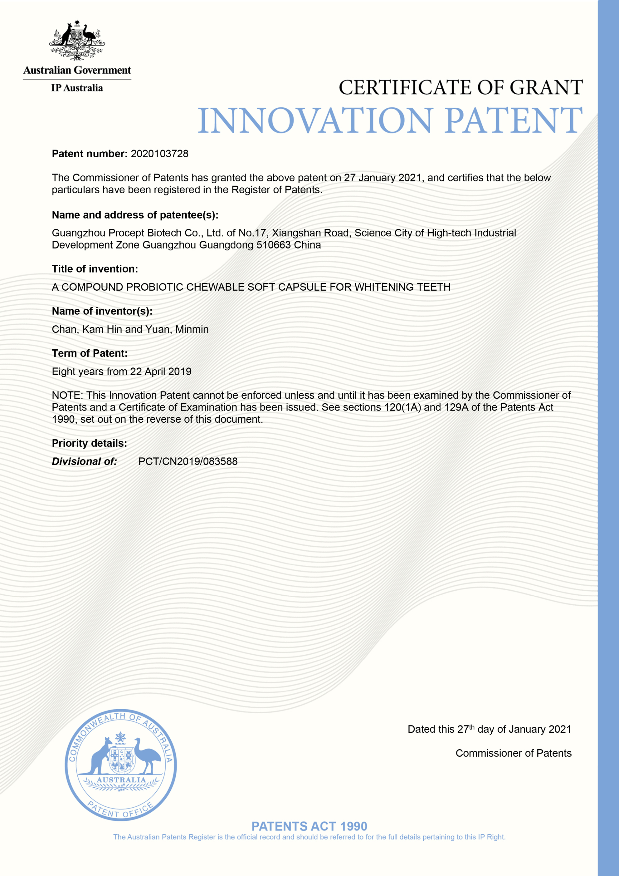 澳大利亞口腔益生菌專(zhuān)利證書(shū)(專(zhuān)利號(hào):2020103728)
