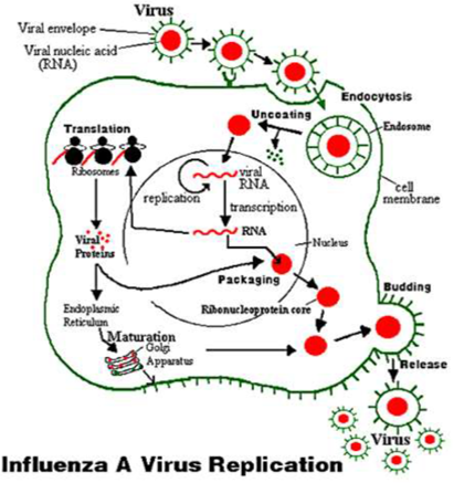 當流感病毒入侵人體時,血凝素(HA)經(jīng)由細胞膜融合進入宿主細胞。神經(jīng)氨酸酶(NA)從感染的細胞內(nèi)被釋放出來,協(xié)助流感病毒進入細胞復制并向外擴散。