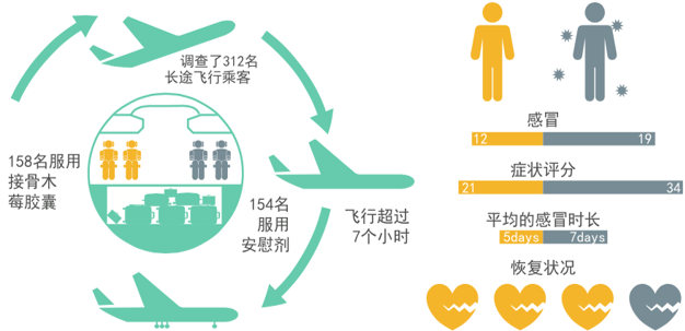 60名流感患者,隨機分成接骨木莓組和安慰劑組,15ml/次接骨木莓糖漿或安慰劑,一天4次,服用5天。接骨木莓組的疼痛,咳嗽,鼻塞充血,呼吸道粘液,睡眠質(zhì)量及總體評價明顯更快得到改善。(滿分10為無病癥狀)