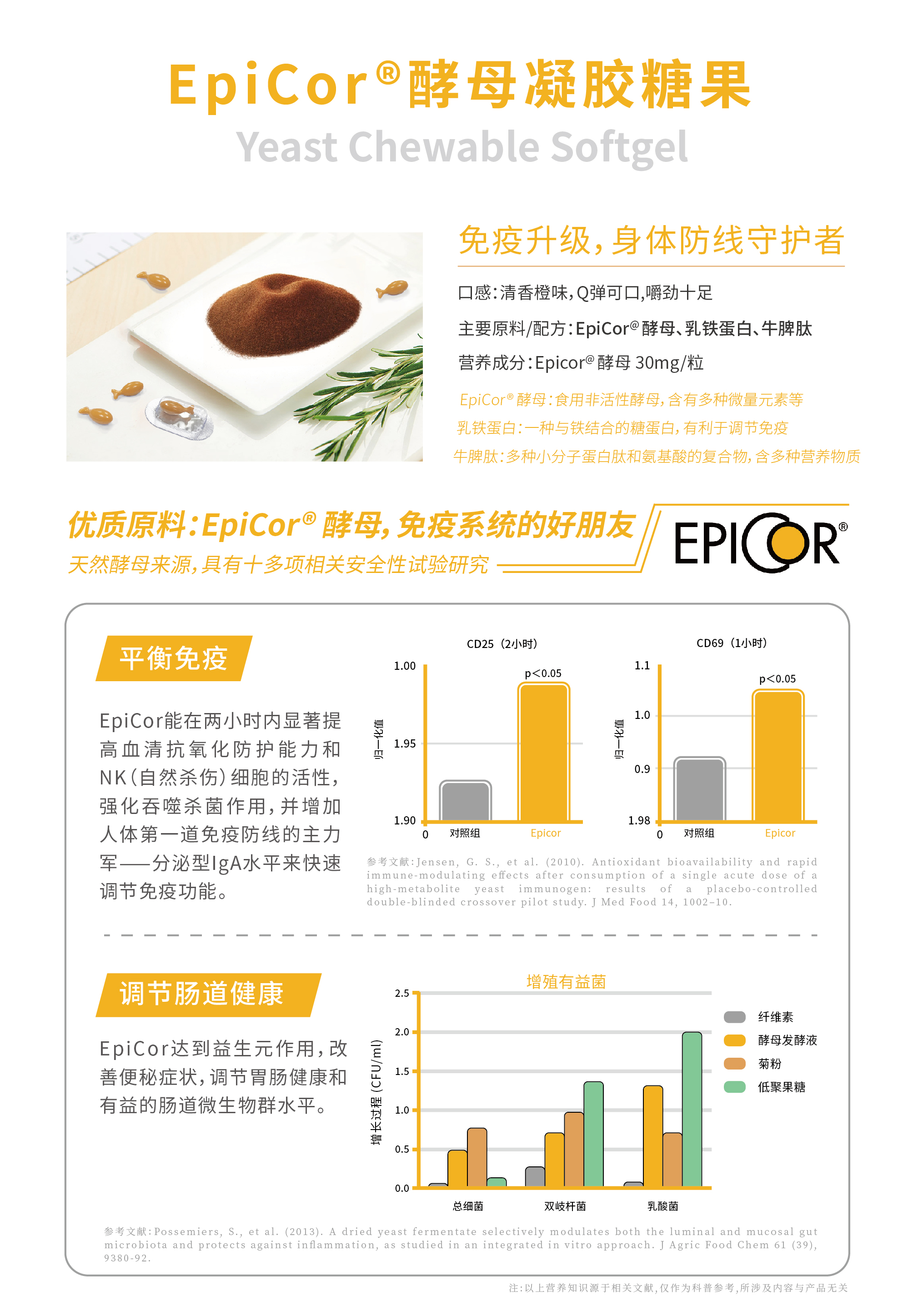 優(yōu)選美國(guó)進(jìn)口原料,EpiCor食用非活性酵母是一種全酵母發(fā)酵物,含有多種蛋白質(zhì)肽類、礦物質(zhì)、抗氧化劑多酚類、β-葡聚糖等多種營(yíng)養(yǎng)物質(zhì),能以平衡地方式激活免疫細(xì)胞、加強(qiáng)腸胃系統(tǒng)(GI)功能;