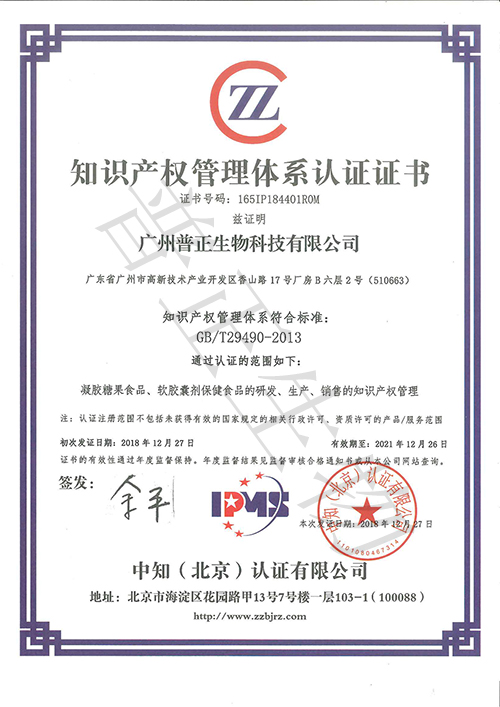 普正生物于2018年12月27日通過了知識產(chǎn)權(quán)管理體系認證,獲得由中知(北京)認證有限公司頒發(fā)的《知識產(chǎn)權(quán)管理體系認證證書》。