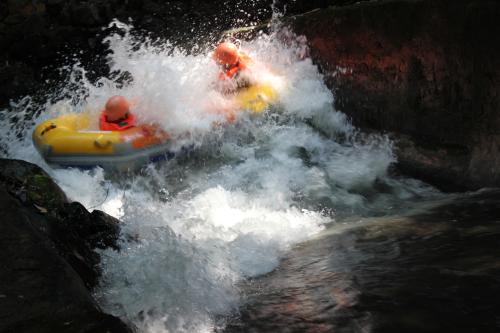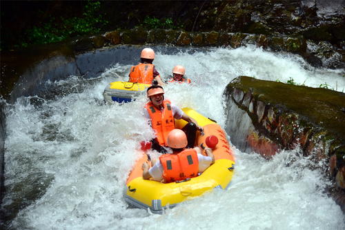 接下來是驚險(xiǎn)刺激的漂流了!被譽(yù)為“浪尖上的過山車”的古龍峽漂流,有著全國最大的漂流落差、最刺激的漂流體驗(yàn)。參加了漂流活動(dòng)的帥哥美女們游玩云天玻霸后,迫不及待地下山,一到漂流地點(diǎn),就歡呼雀躍地穿上救生衣和頭盔,縱身跳上橡皮艇,隨著清流激湍一路漂游而下,體驗(yàn)一把過山車般的刺激快感!