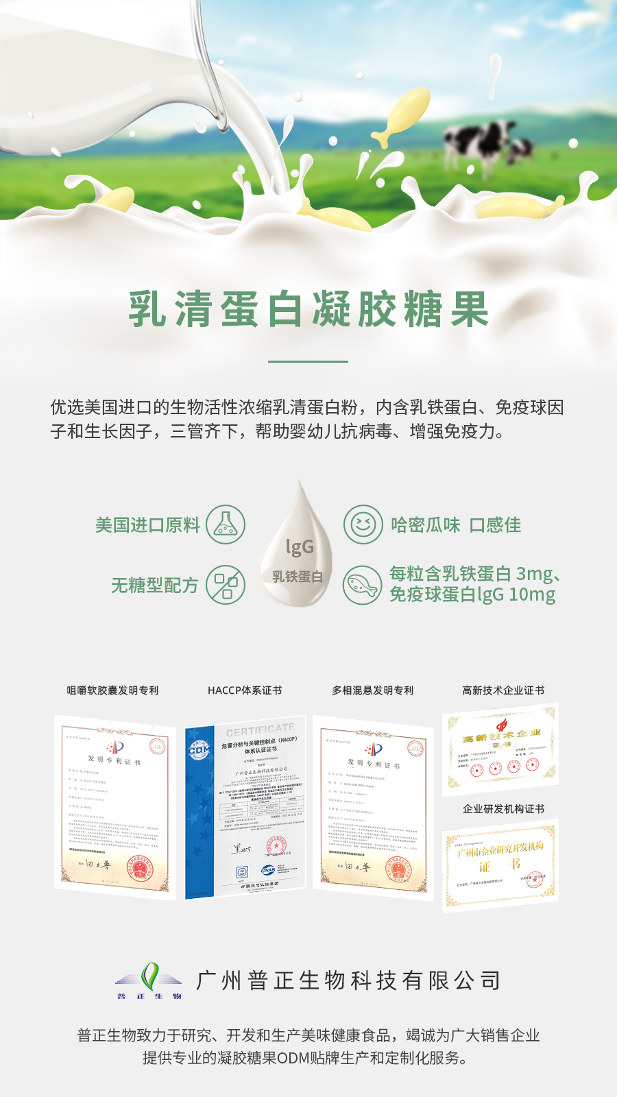 我們研發(fā)的乳清蛋白凝膠糖果,可愛的小魚形狀,蜜瓜牛奶口味,一粒含有3毫克的乳鐵蛋白和約10毫克的免疫球蛋白IgG,運用普正自有的iChew技術進行深加工,令其咀嚼起來口感更細膩軟糯,內容物粒徑達到數十微米級別更利吸收,天然貼合寶寶的營養(yǎng)需求,讓寶寶喜歡吃,放心吃,健康吃!